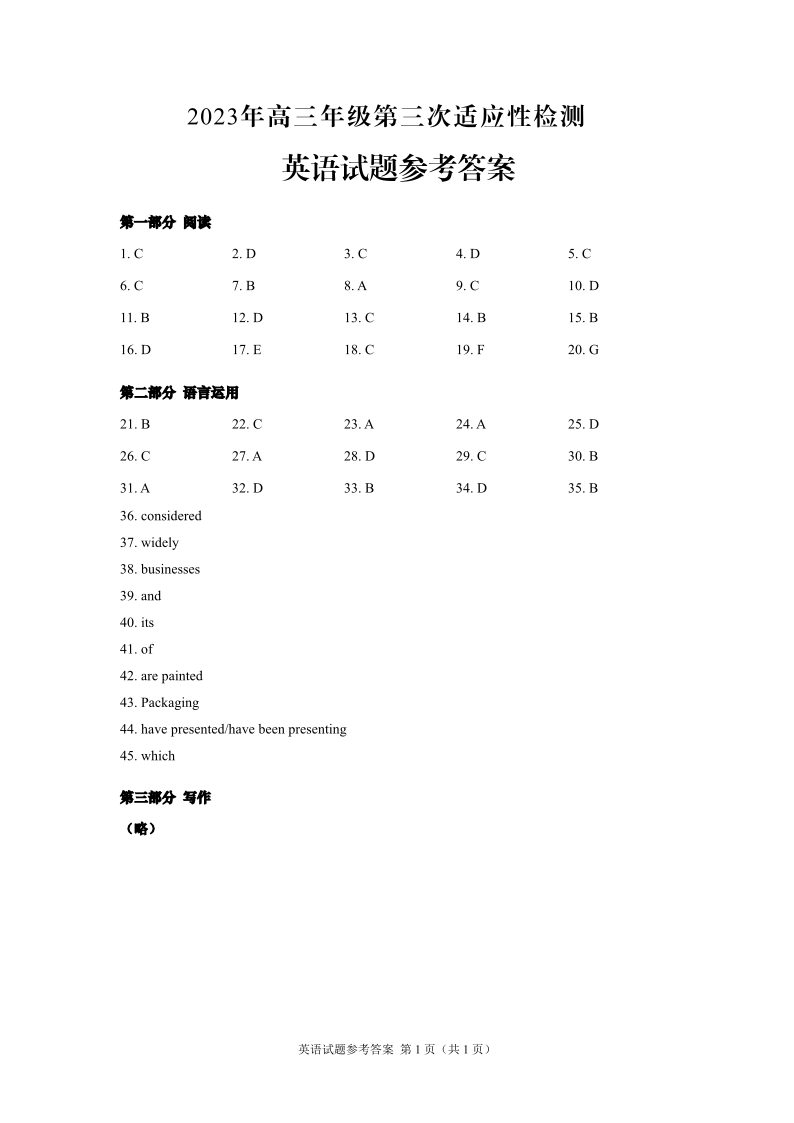 3山东省青岛市2023.5高三年级第三次模拟考试英语答案