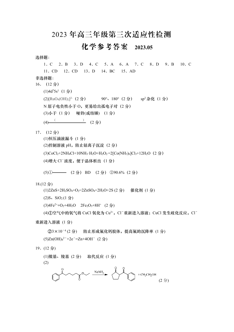 山东省青岛市2023.5高三年级第三次模拟考试化学答案