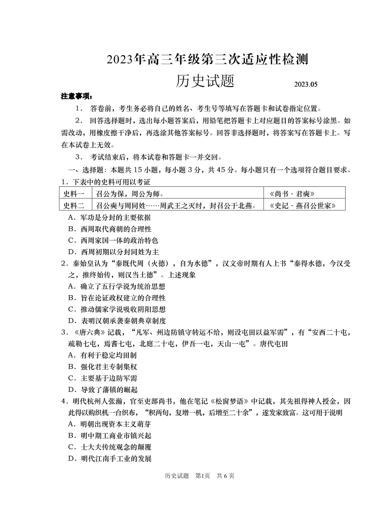 山东省青岛市2023.5高三年级第三次模拟考试历史