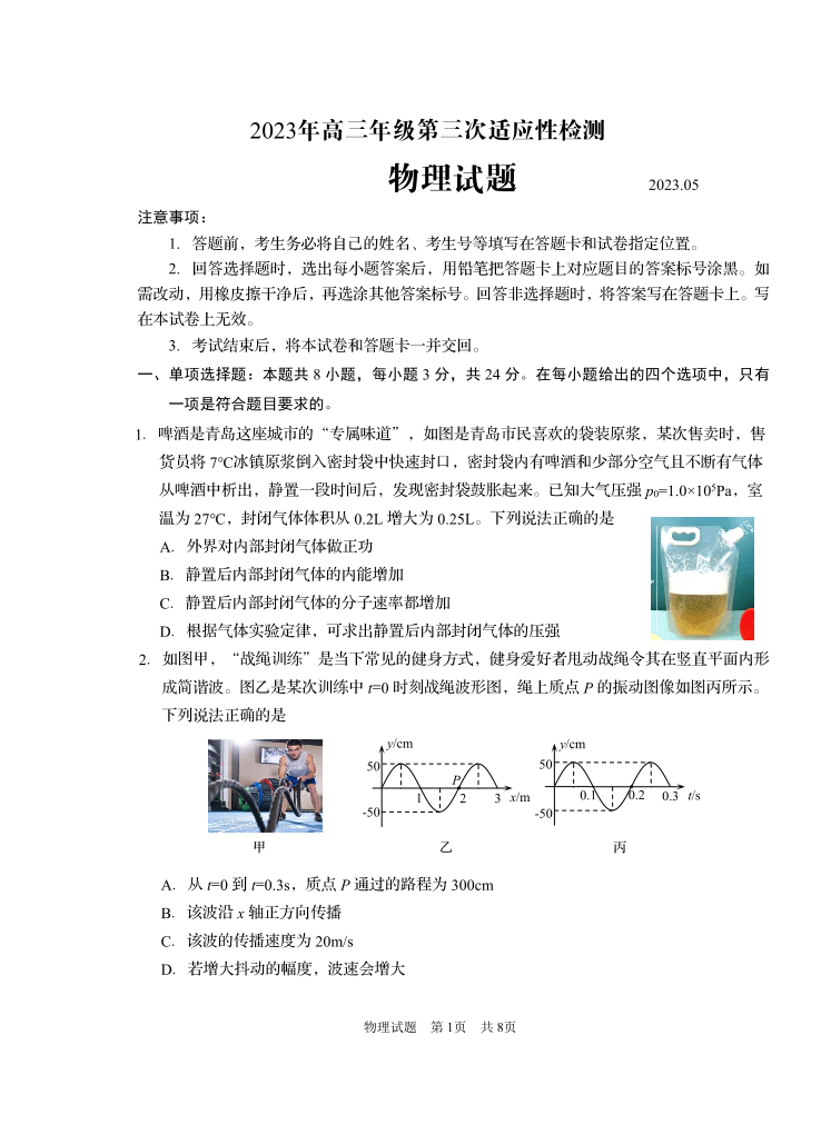 山东省青岛市2023.5高三年级第三次模拟考试物理