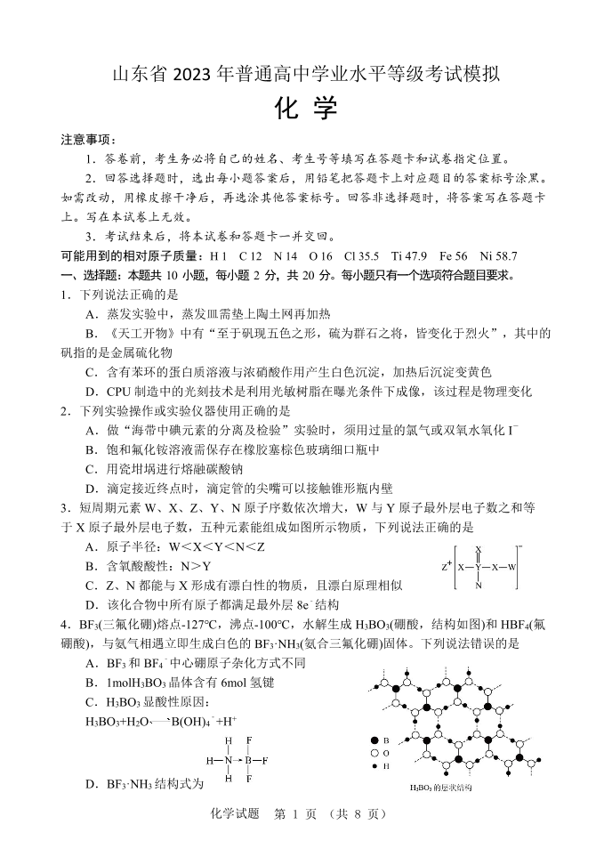 山东省潍坊市区域2023.6高三年级考前模拟热身化学