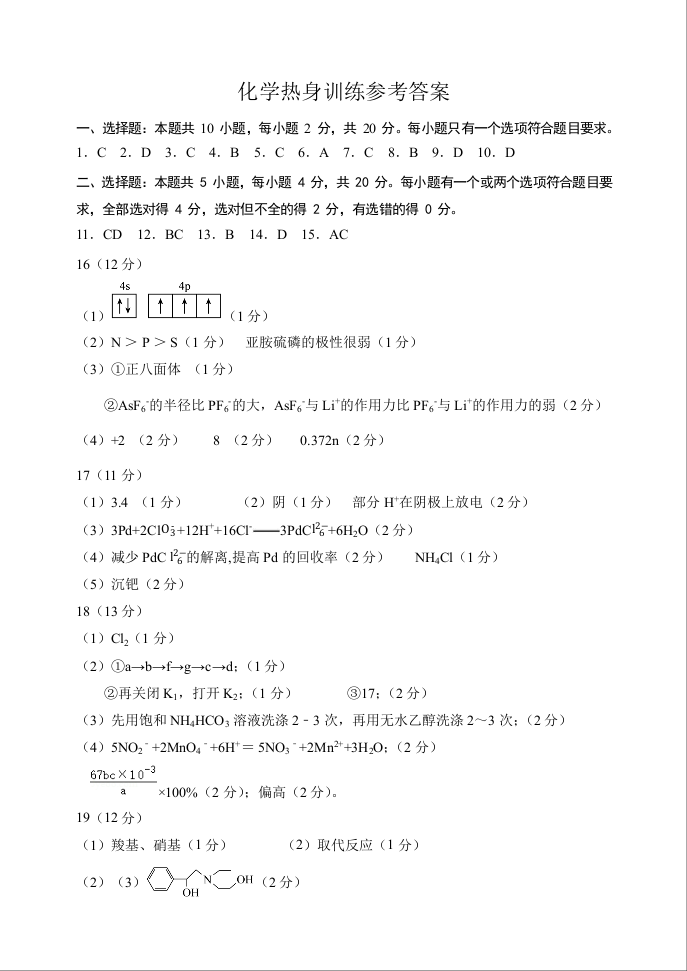 山东省潍坊市区域2023.6高三年级考前模拟热身化学答案