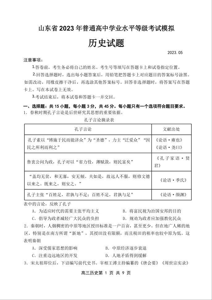 山东省潍坊市区域2023.6高三年级考前模拟热身历史