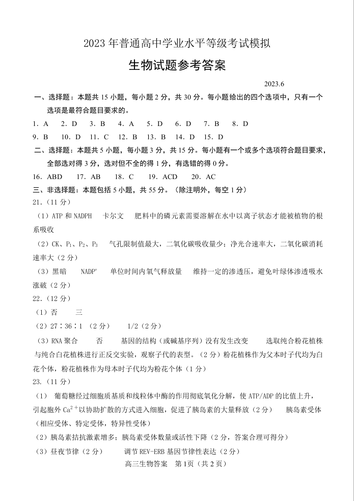 山东省潍坊市区域2023.6高三年级考前模拟热身生物答案