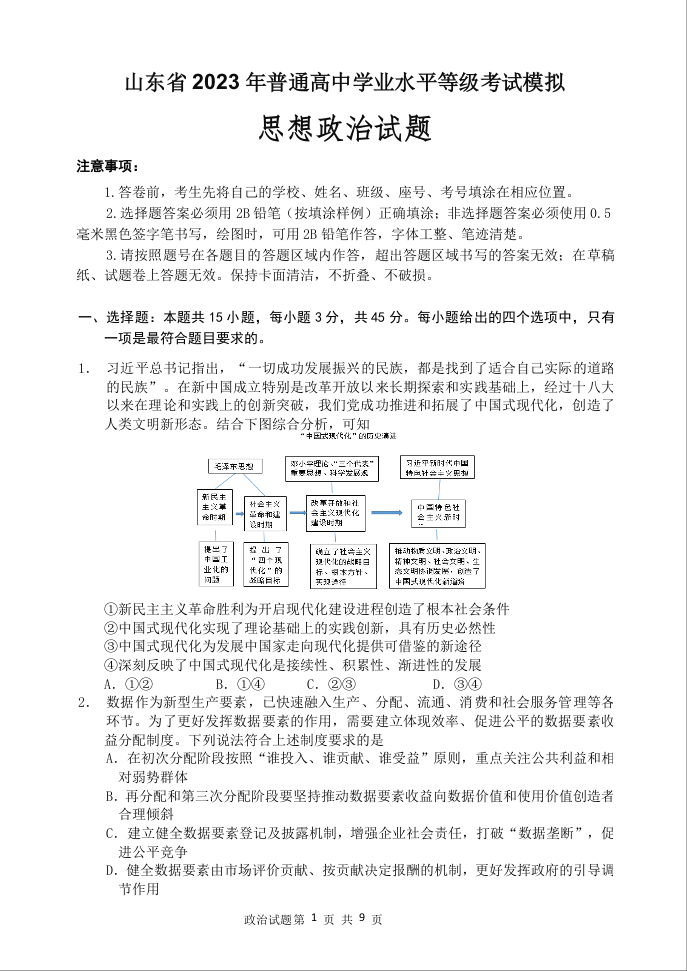 山东省潍坊市区域2023.6高三年级考前模拟热身政治