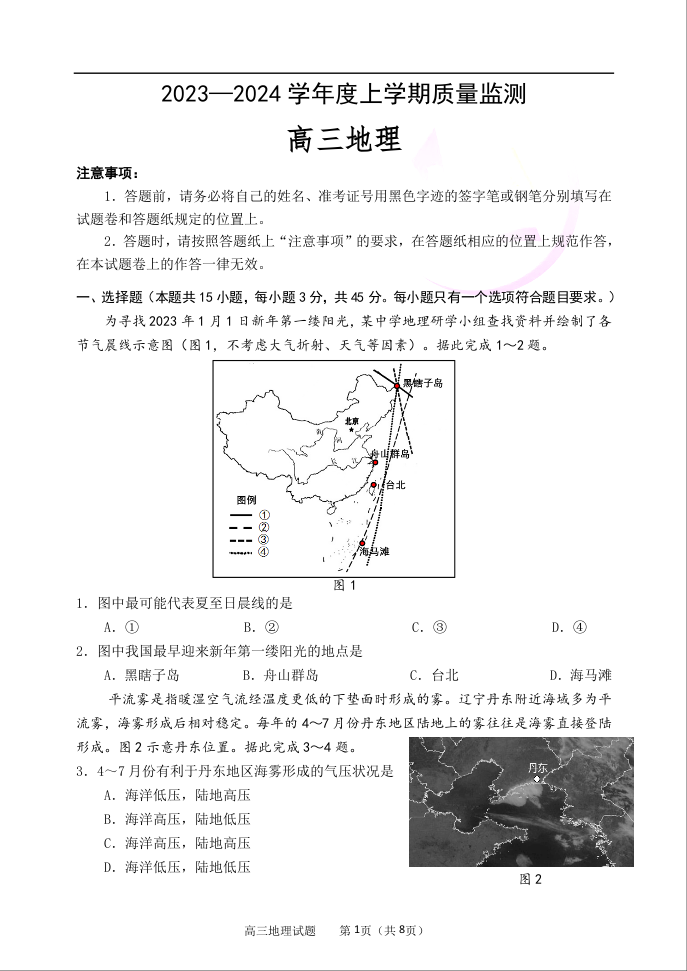 山东省潍坊市五县市2023.10高三年级阶段监测地理