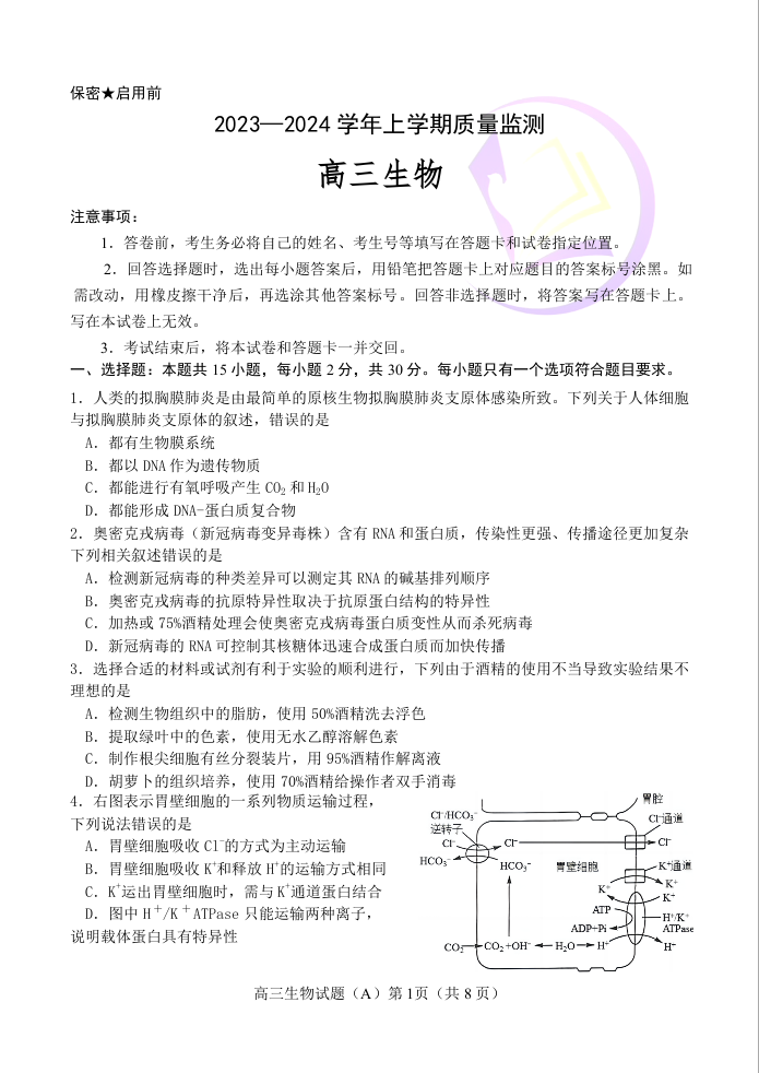 山东省潍坊市五县市2023.10高三年级阶段监测生物