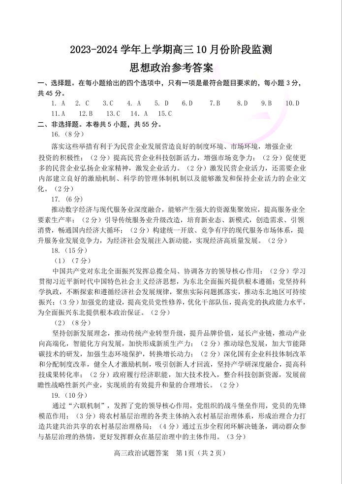 山东省潍坊市五县市2023.10高三年级阶段监测政治答案