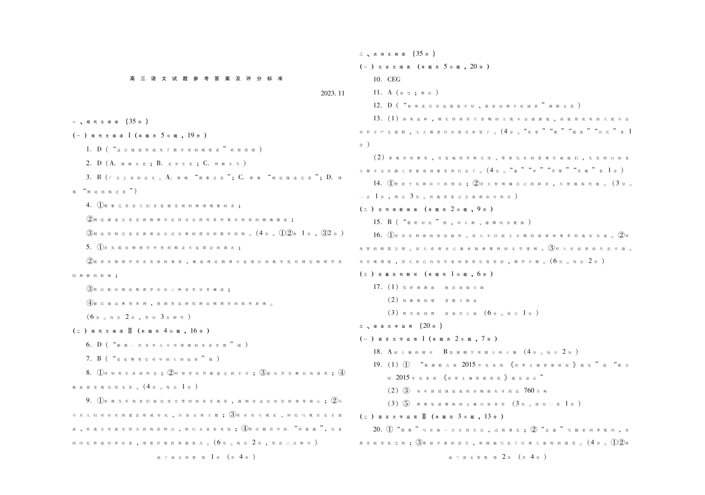 1山东省潍坊市2023.11高三年级期中考试语文答案