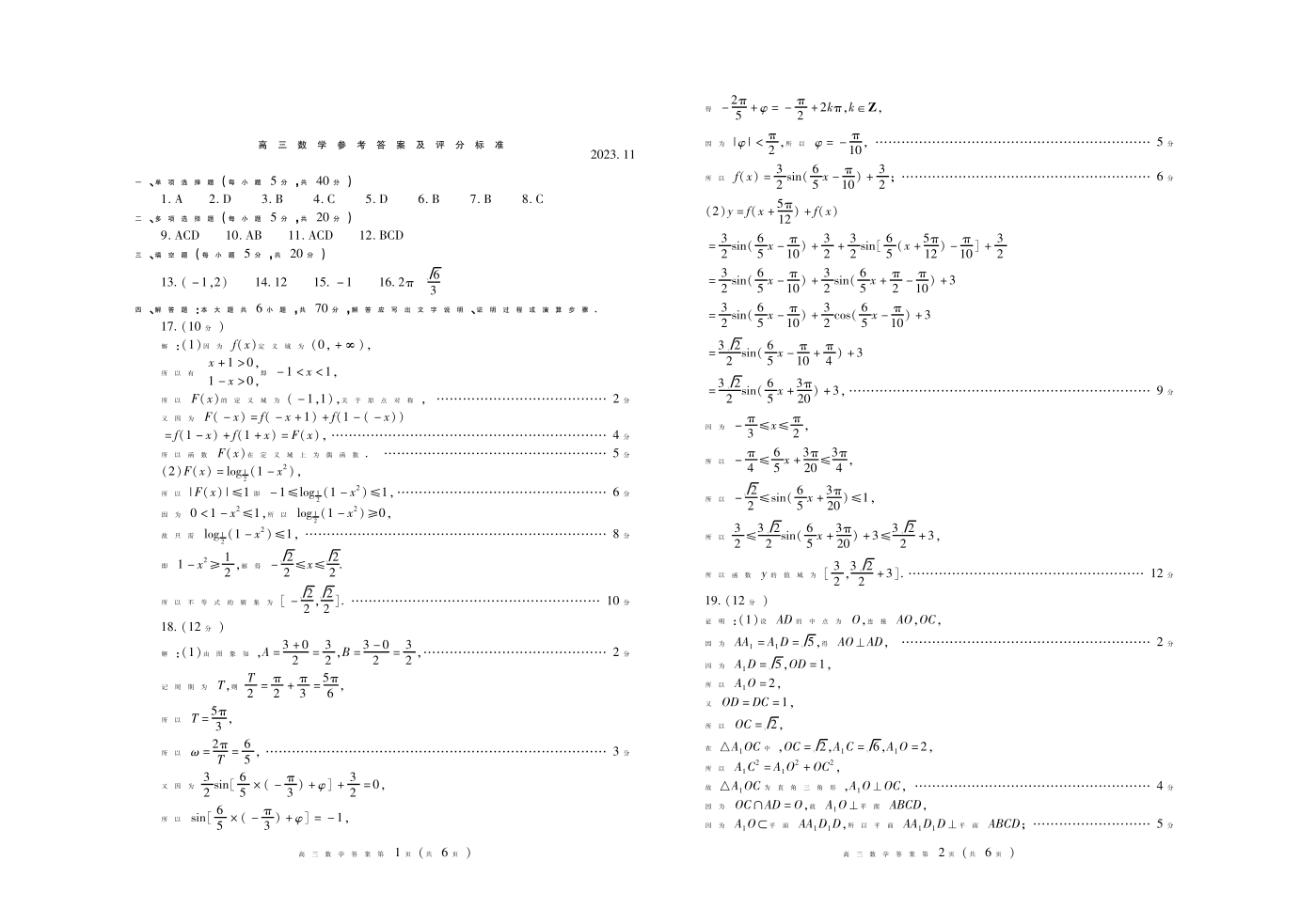 2山东省潍坊市2023.11高三年级期中考试数学答案