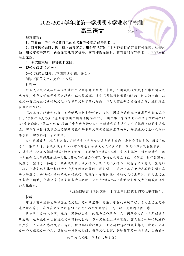 1山东省青岛市2024.1高三年级期末考试语文