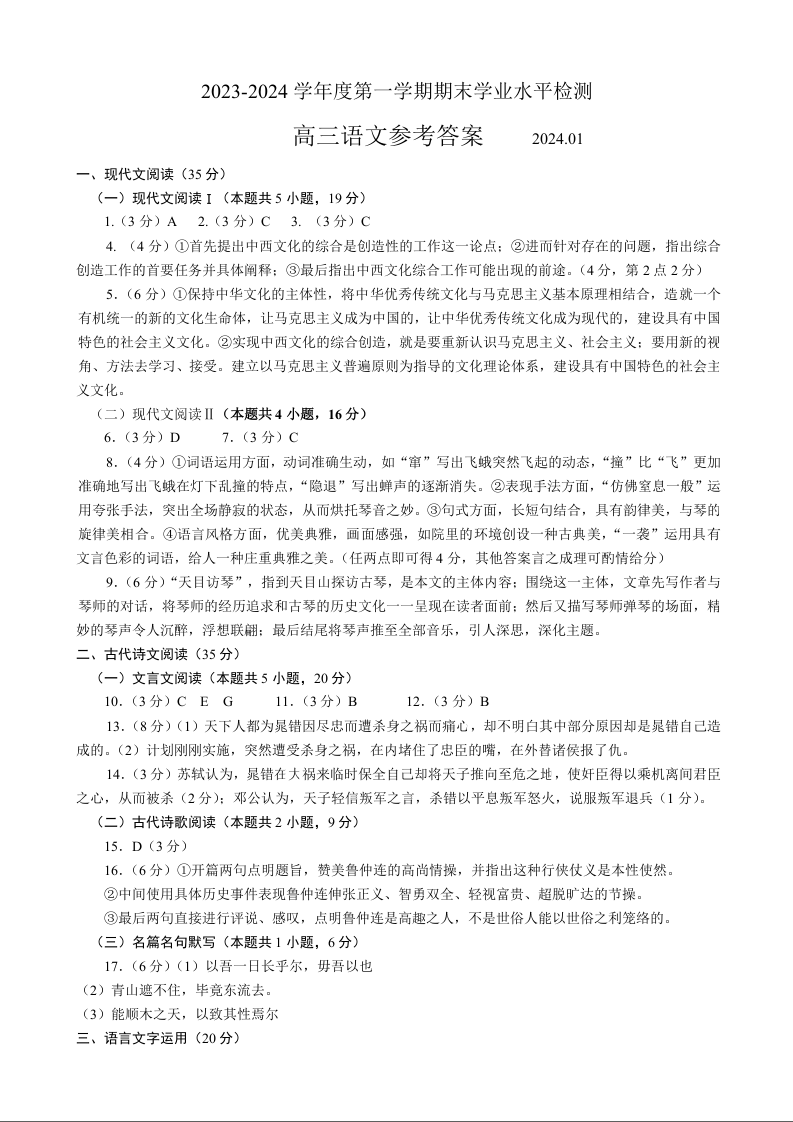 1山东省青岛市2024.1高三年级期末考试语文定稿