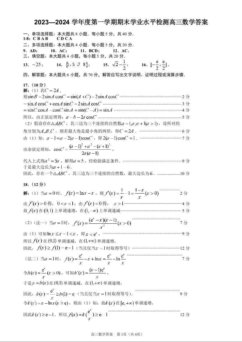 2山东省青岛市2024.1高三年级期末考试数学答案