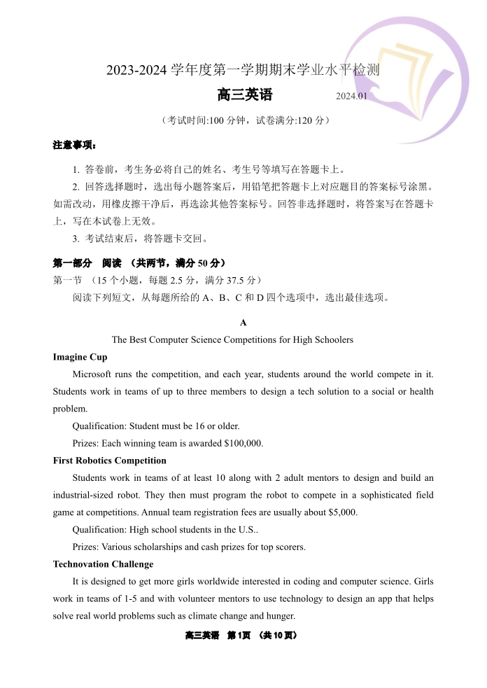 3山东省青岛市2024.1高三年级期末考试英语