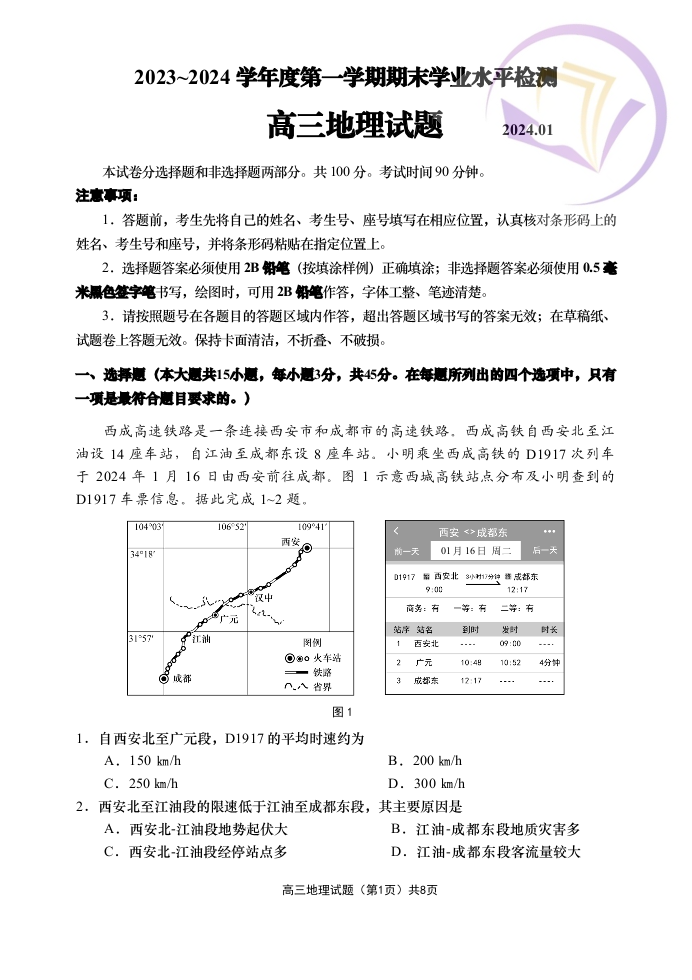 山东省青岛市2024.1高三年级期末考试地理