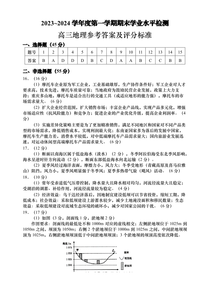 山东省青岛市2024.1高三年级期末考试地理答案