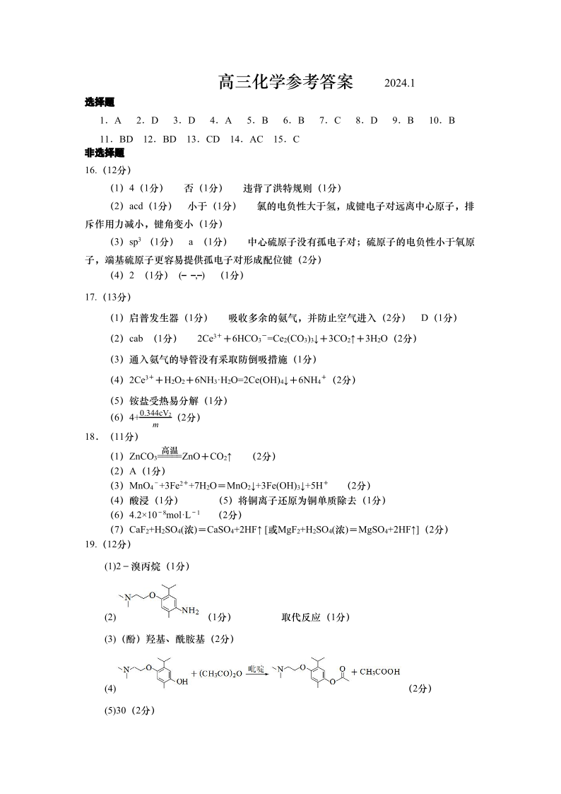 山东省青岛市2024.1高三年级期末考试化学答案