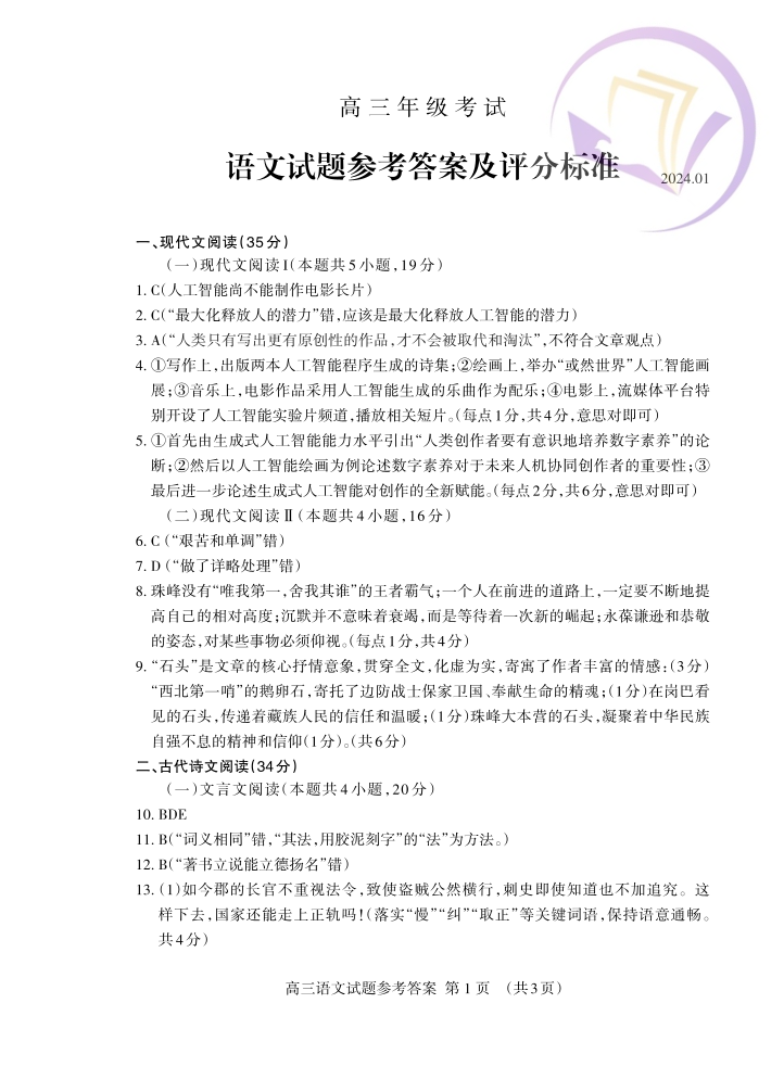 1山东省泰安市2024.1高三年级期末考试语文答案