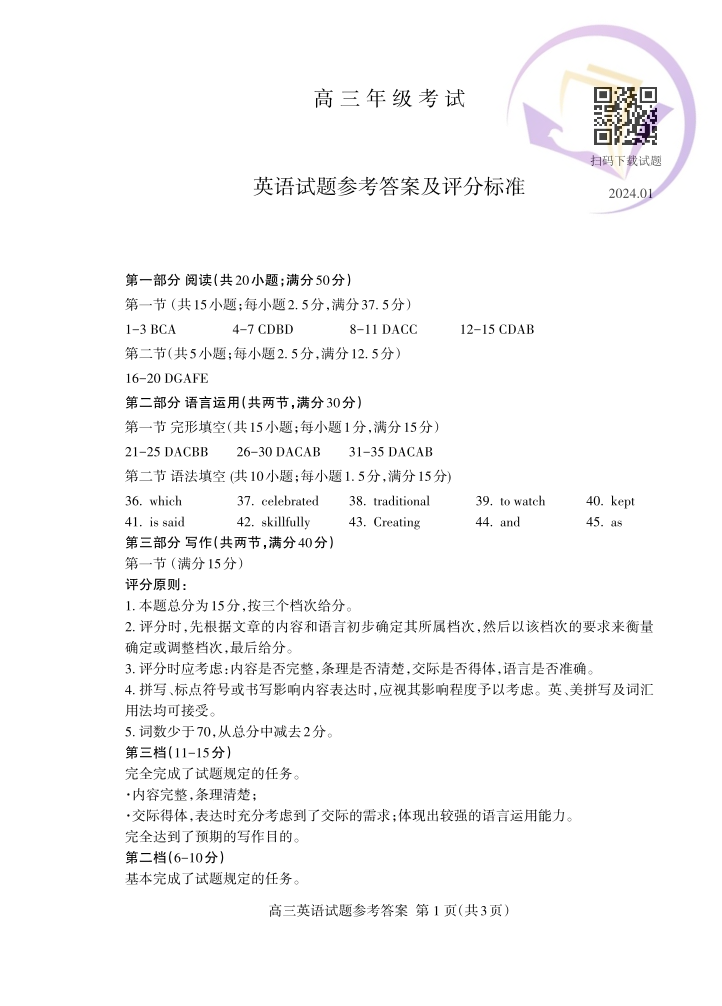 3山东省泰安市2024.1高三年级期末考试英语答案
