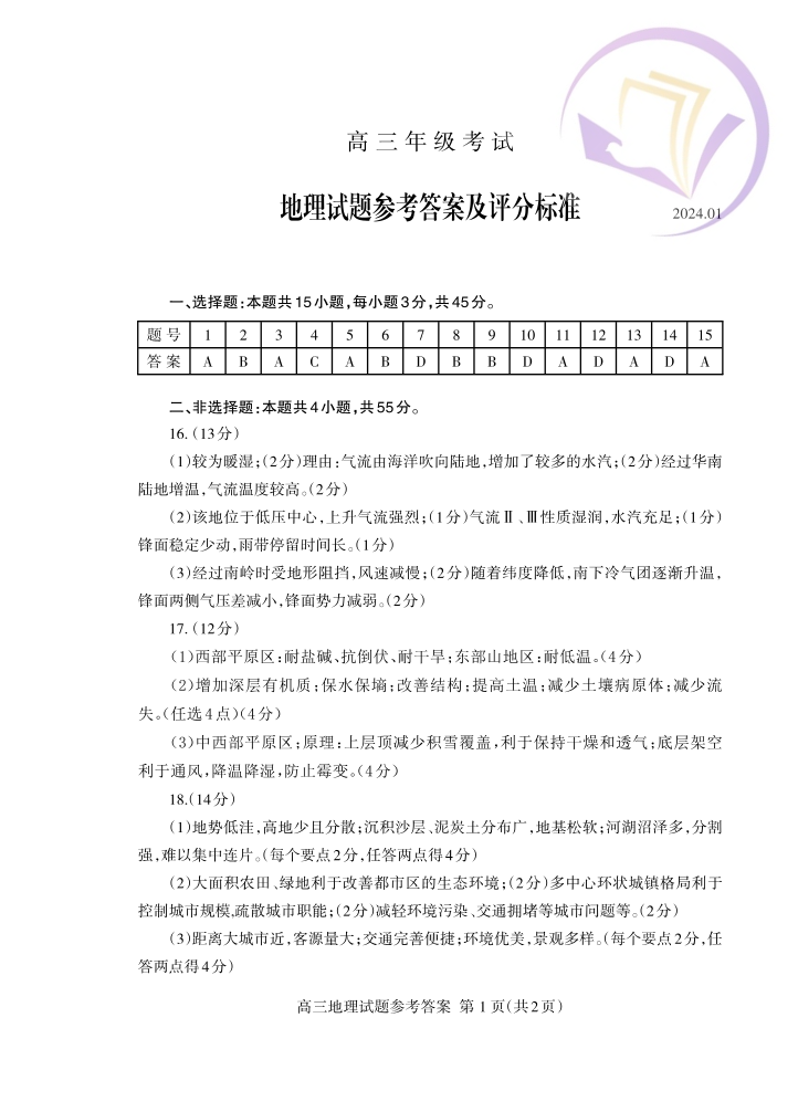 山东省泰安市2024.1高三年级期末考试地理答案