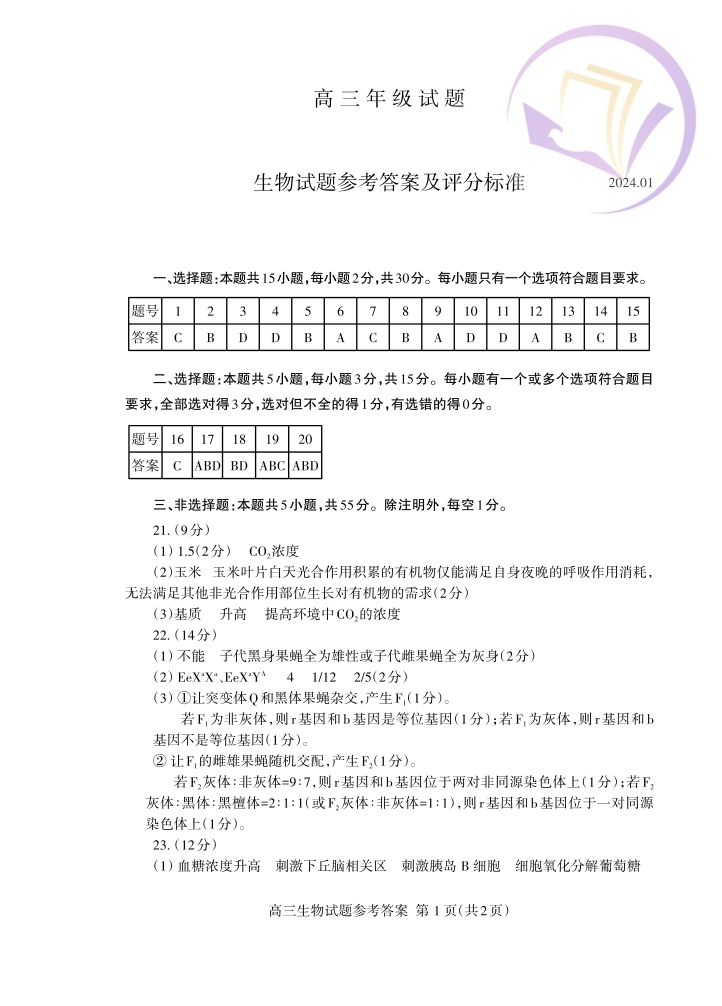 山东省泰安市2024.1高三年级期末考试生物答案