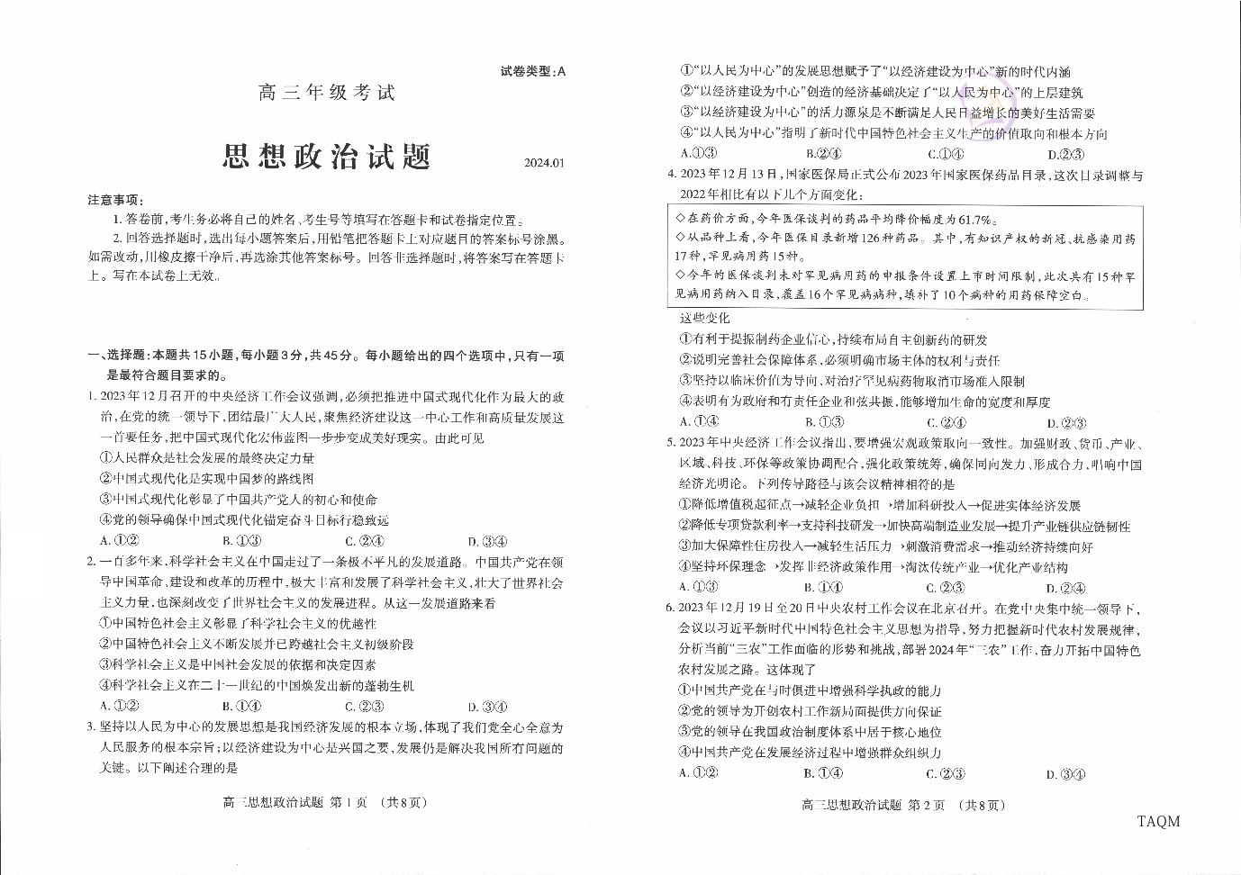 山东省泰安市2024.1高三年级期末考试政治