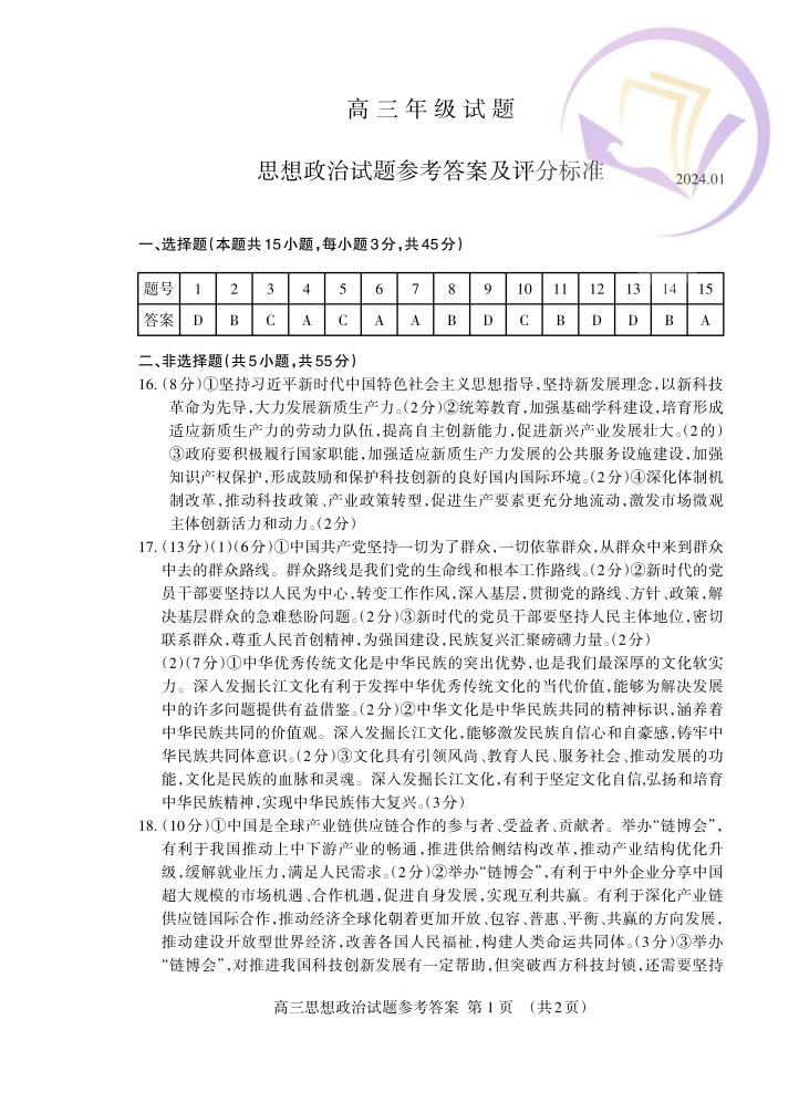 山东省泰安市2024.1高三年级期末考试政治答案
