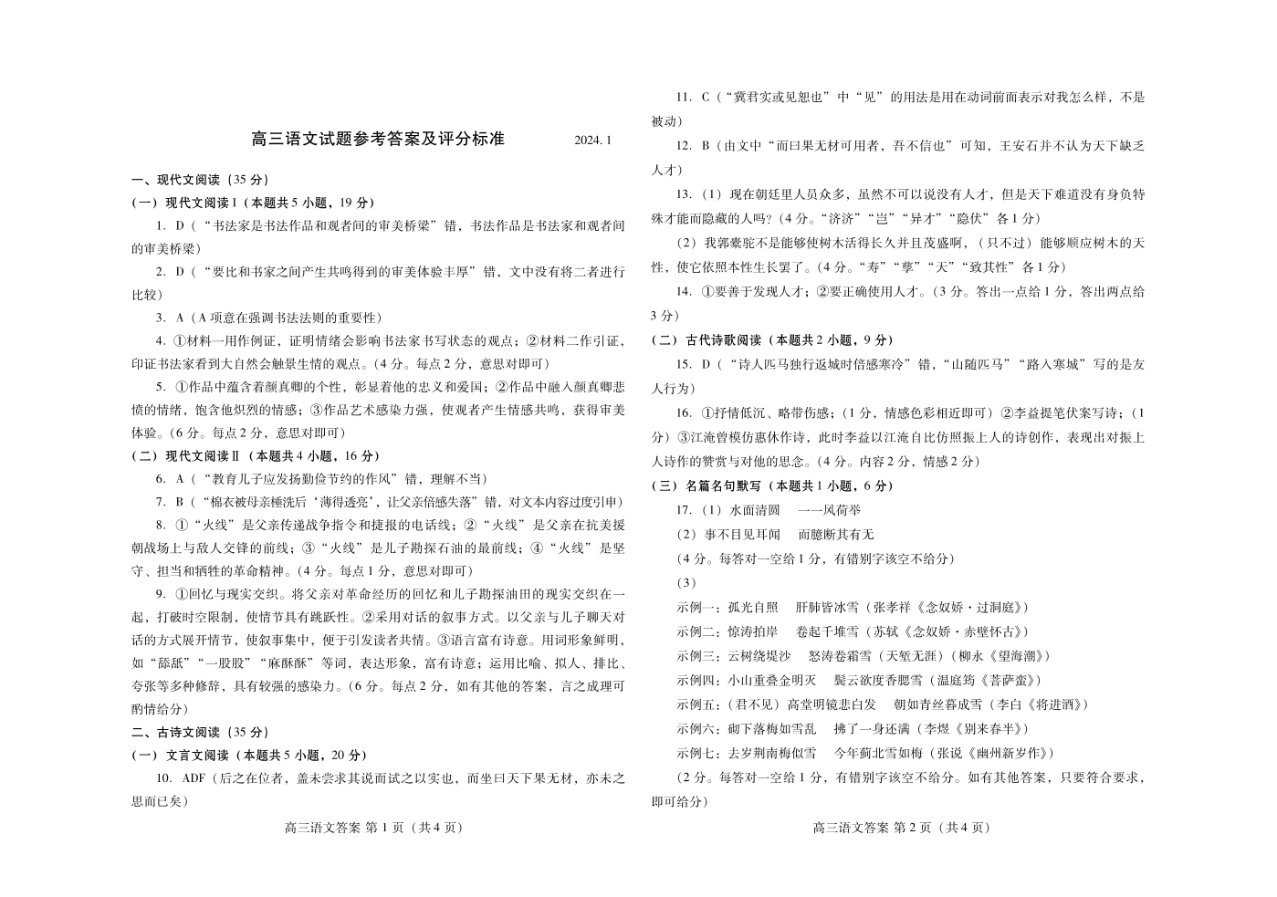 1山东省潍坊市2024.1高三年级期末考试语文答案