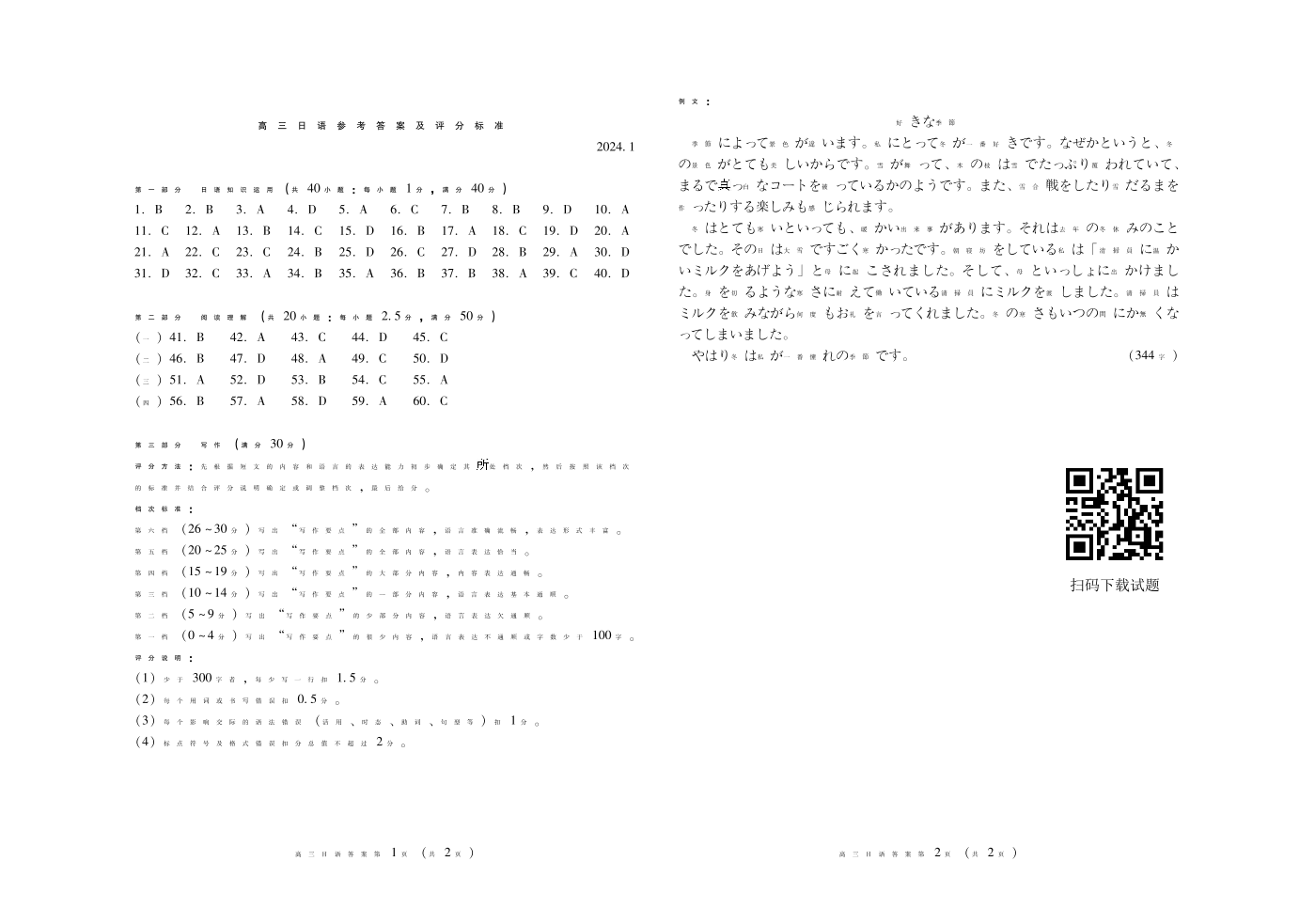 4山东省潍坊市2024.1高三年级期末考试日语答案
