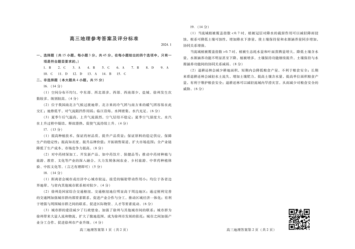 山东省潍坊市2024.1高三年级期末考试地理答案