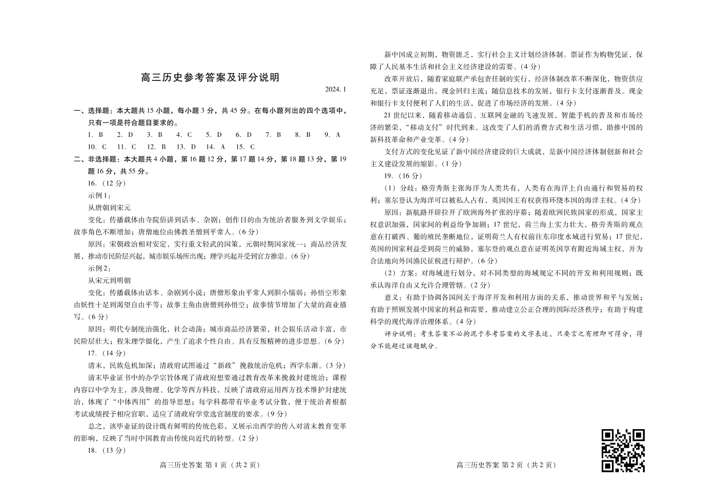 山东省潍坊市2024.1高三年级期末考试历史答案