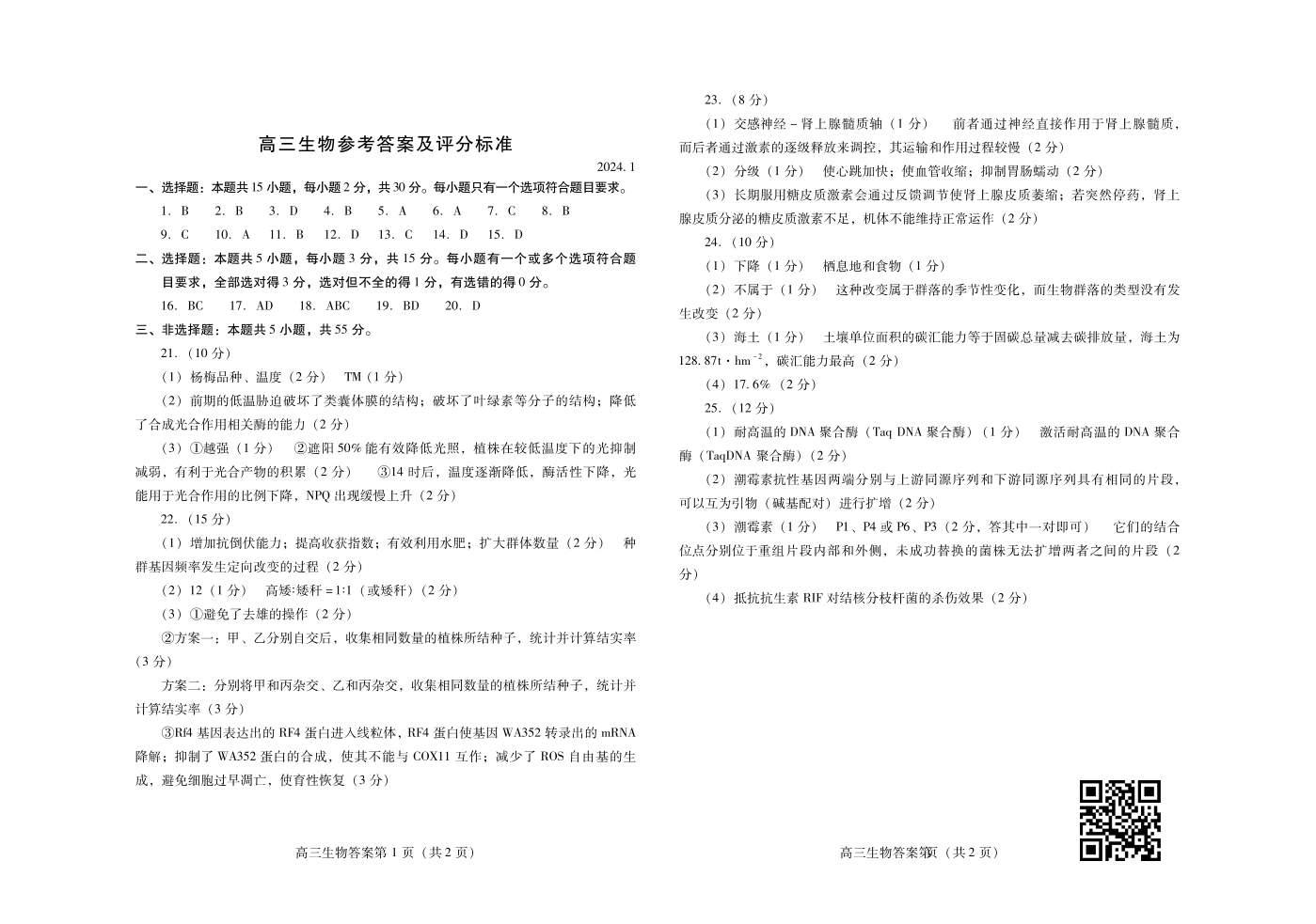 山东省潍坊市2024.1高三年级期末考试生物答案
