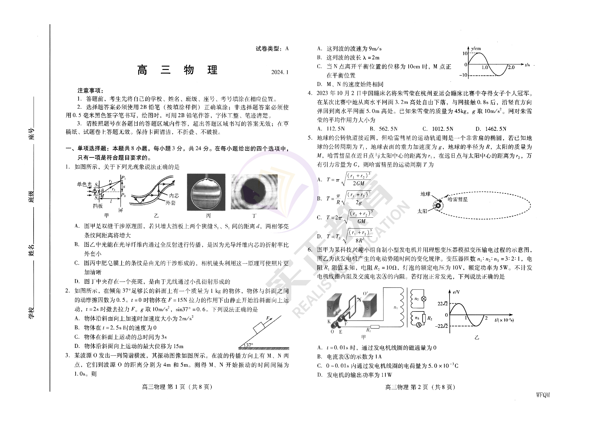 山东省潍坊市2024.1高三年级期末考试物理