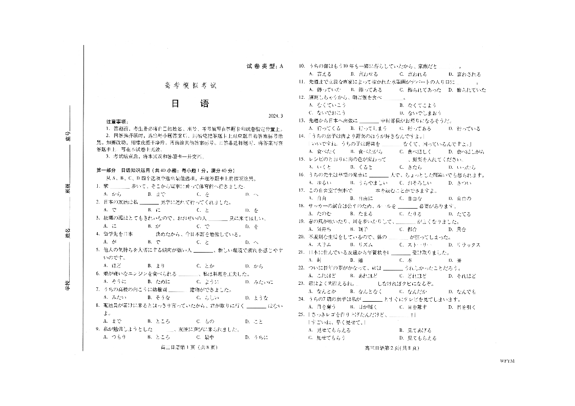 4山东省潍坊市2024.3高三年级第一次模拟日语