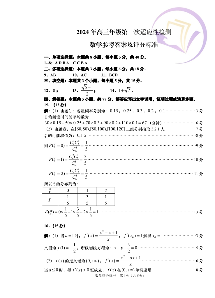 2山东省青岛市2024.3高三年级第一次模拟数学答案
