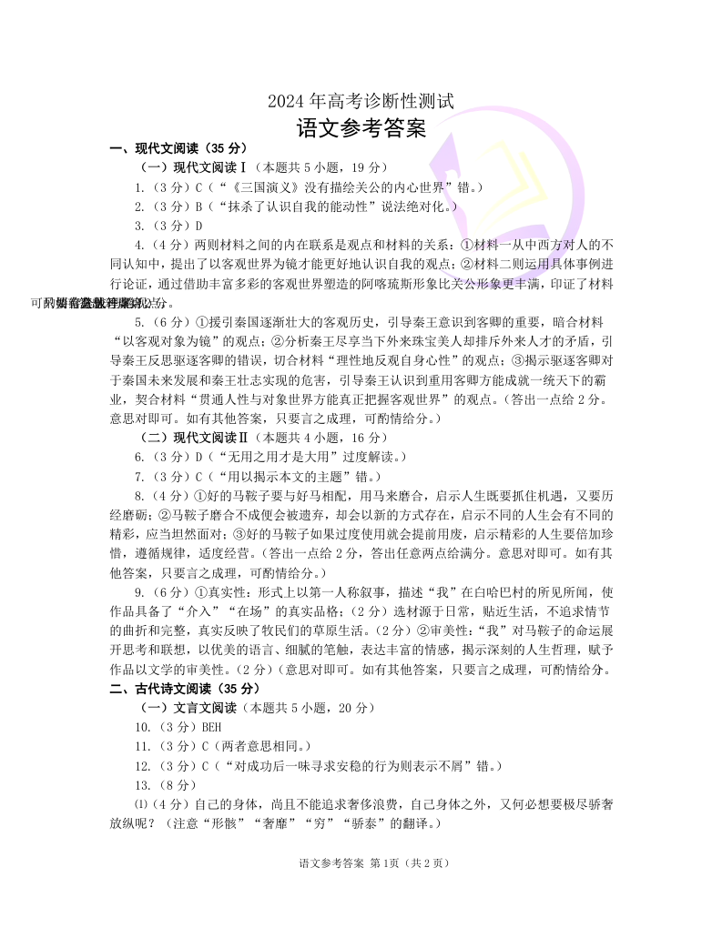 1山东省烟台市2024.3高三年级第一次模拟语文答案