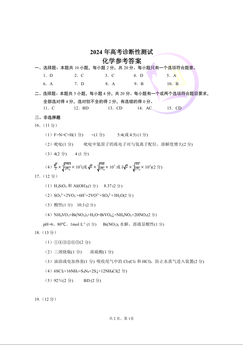 山东省烟台市2024.3高三年级第一次模拟化学答案