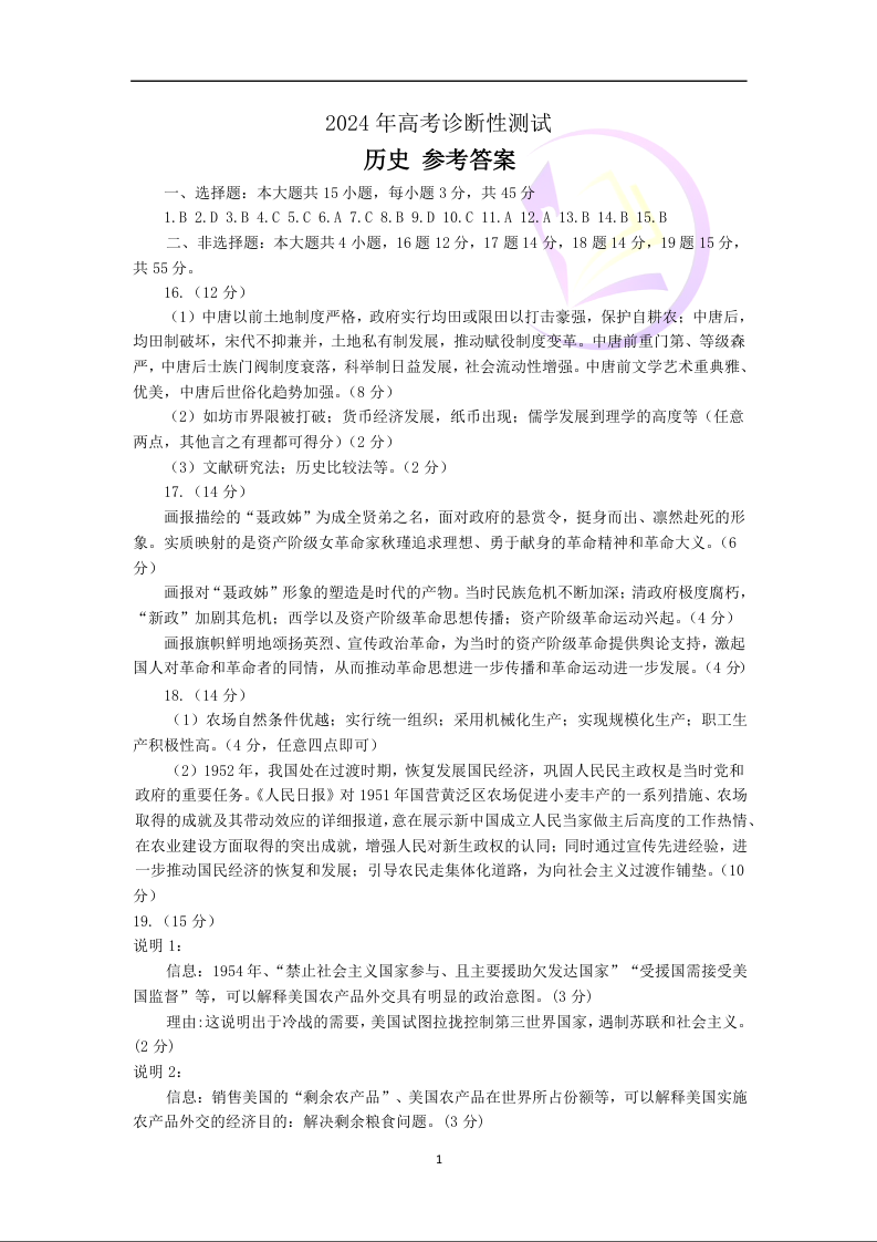 山东省烟台市2024.3高三年级第一次模拟历史答案