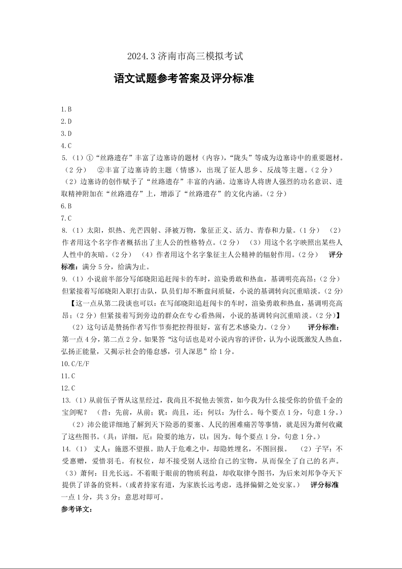 山东省济南市2024.3高三年级第一次模拟语文答案