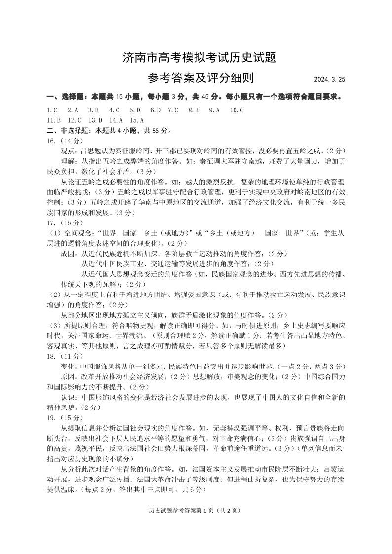 山东省济南市2024.3高三年级第一次模拟历史答案