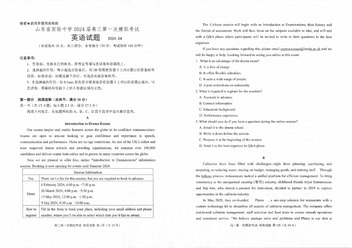 3山东省实验中学2024.4高三年级第一次模拟英语