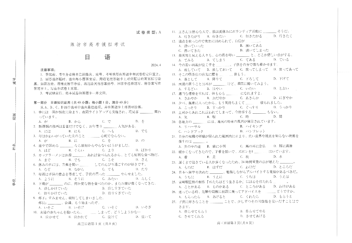4山东省潍坊市2024.4高三年级第二次模拟日语