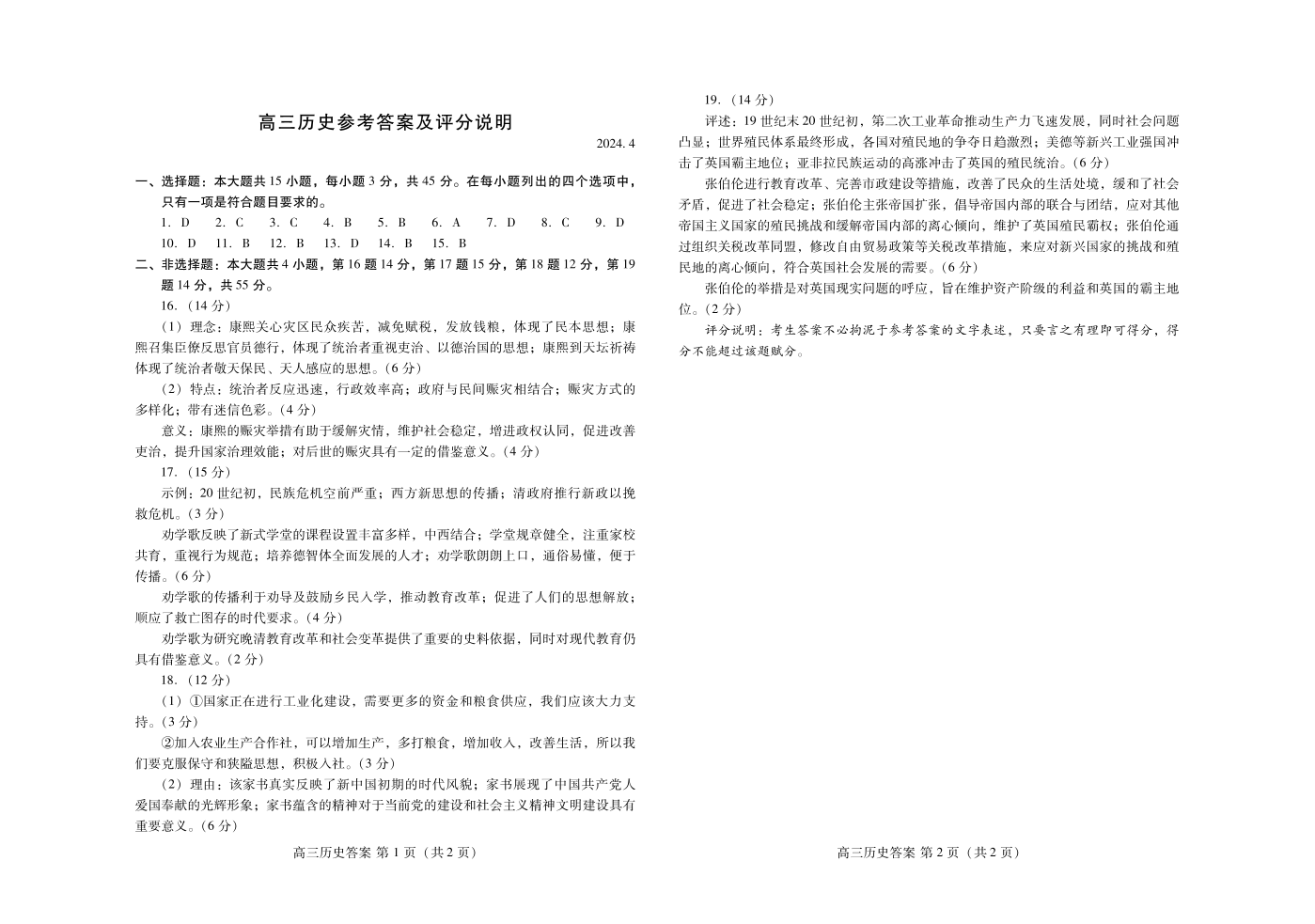 山东省潍坊市2024.4高三年级第二次模拟历史答案