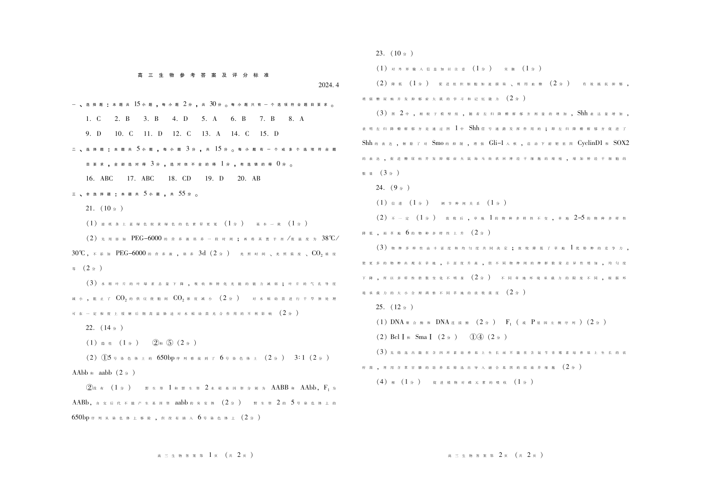 山东省潍坊市2024.4高三年级第二次模拟生物答案