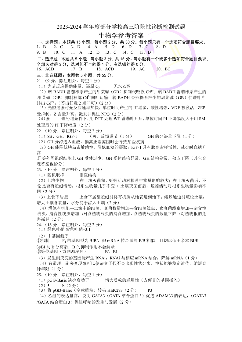 山东省淄博市2024.4高三年级第二次模拟生物答案