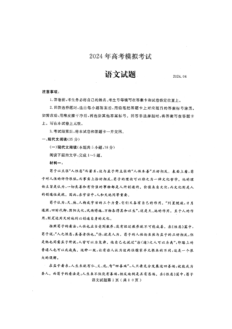 1山东省济宁市2024.4高三年级第二次模拟语文