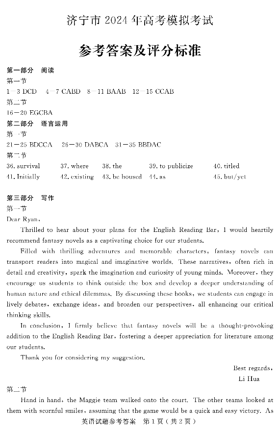 3山东省济宁市2024.4高三年级第二次模拟英语答案