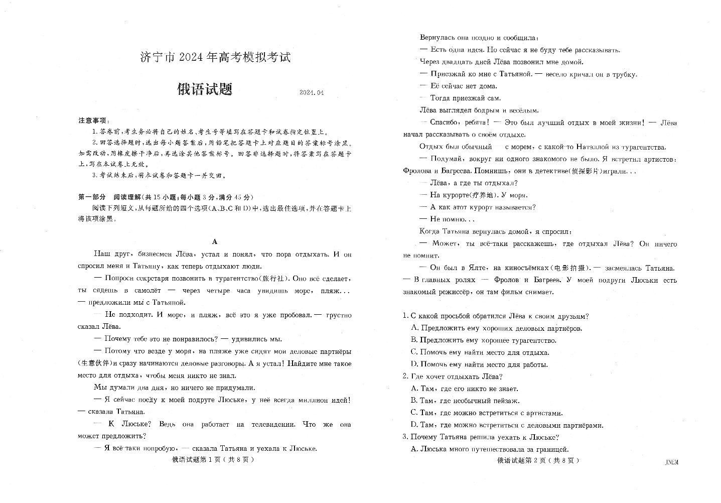 5山东省济宁市2024.4高三年级第二次模拟俄语
