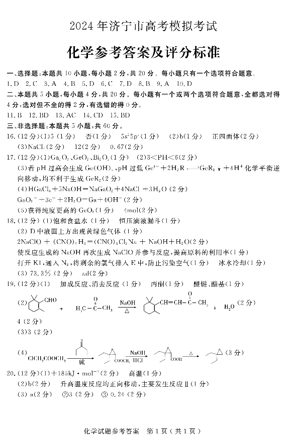 山东省济宁市2024.4高三年级第二次模拟化学答案