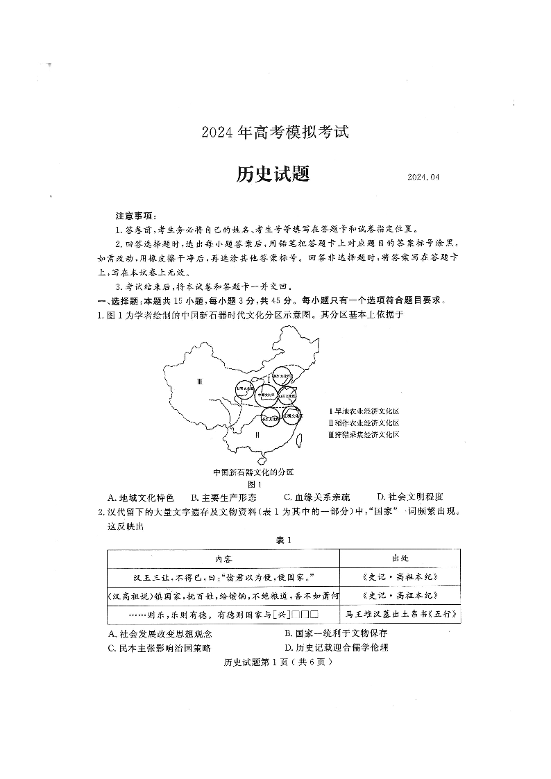 山东省济宁市2024.4高三年级第二次模拟历史